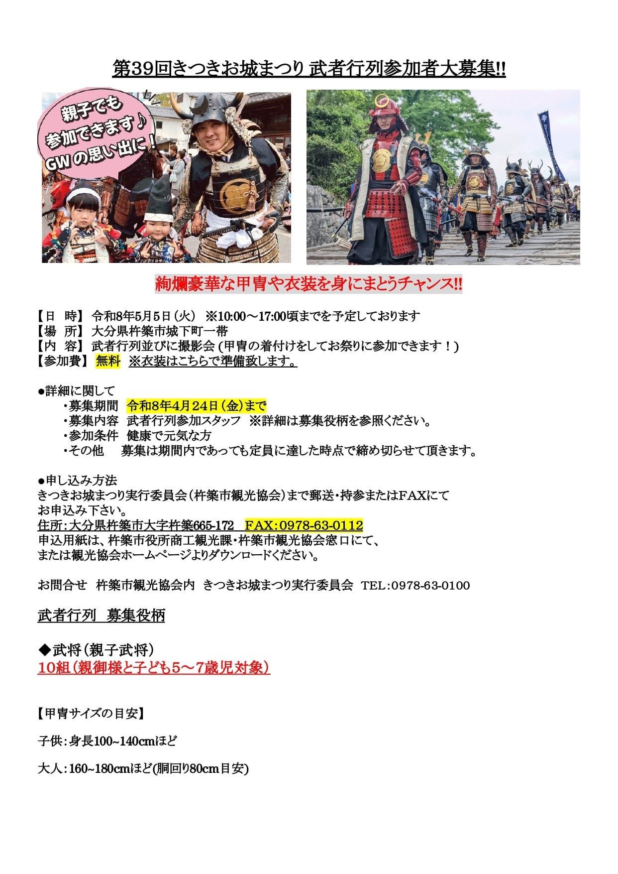 2026年5月5日(火・祝)に開催予定の「第39回 きつきお城まつり」で行われる武者行列の仮装スタッフを募集しています。